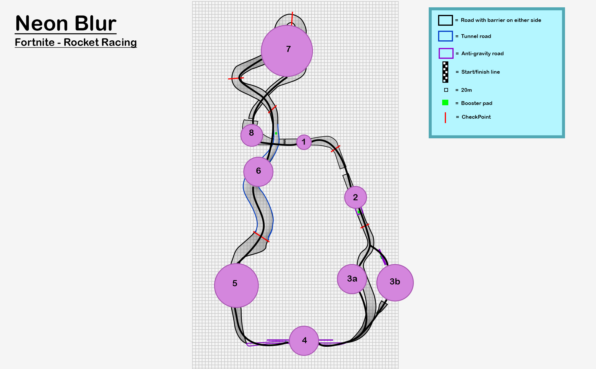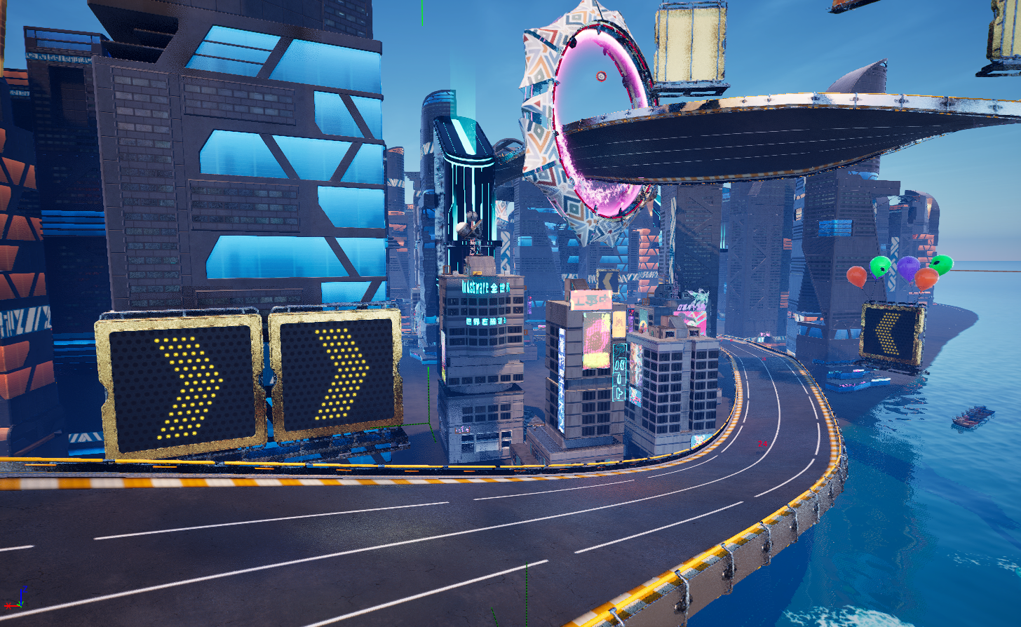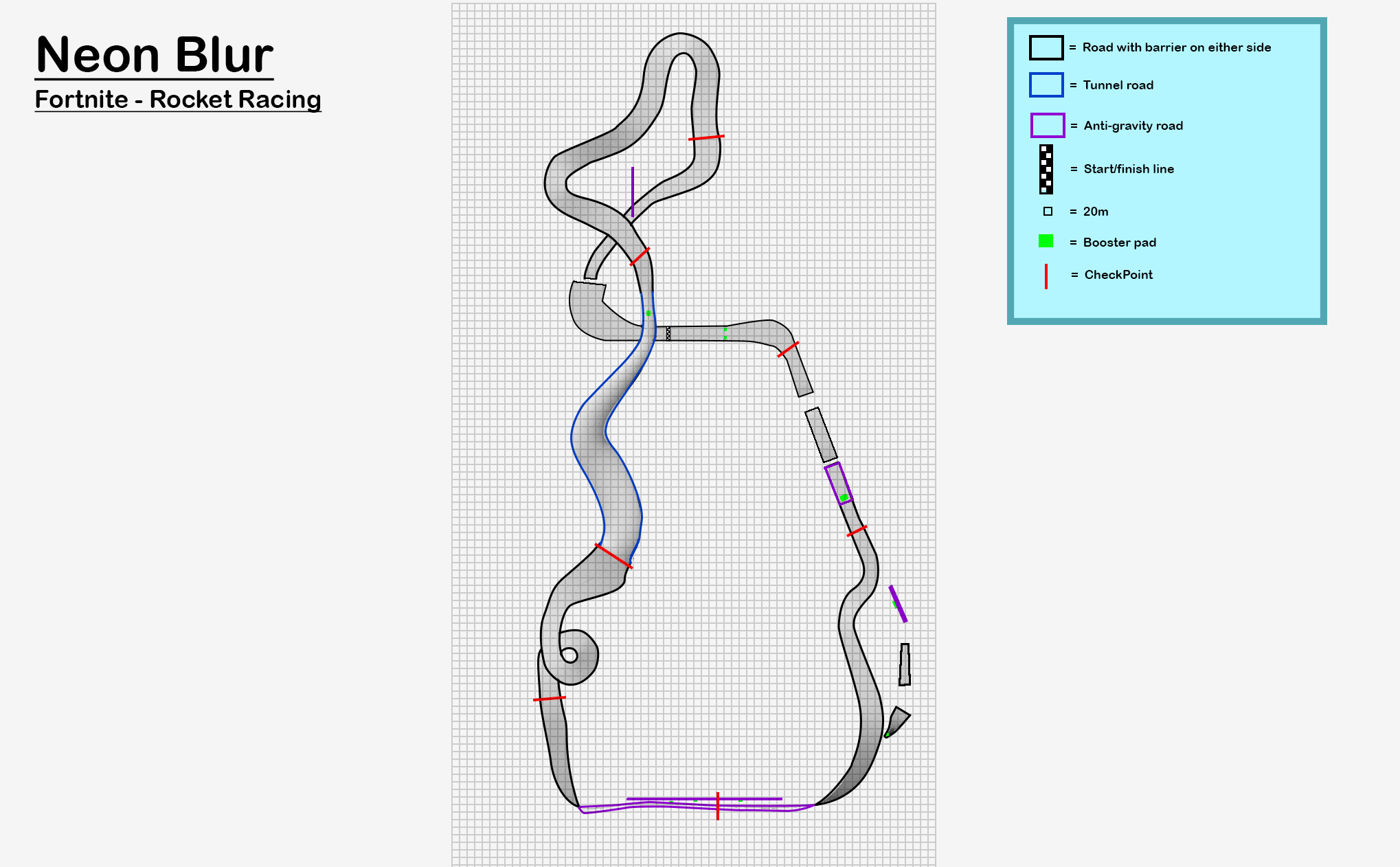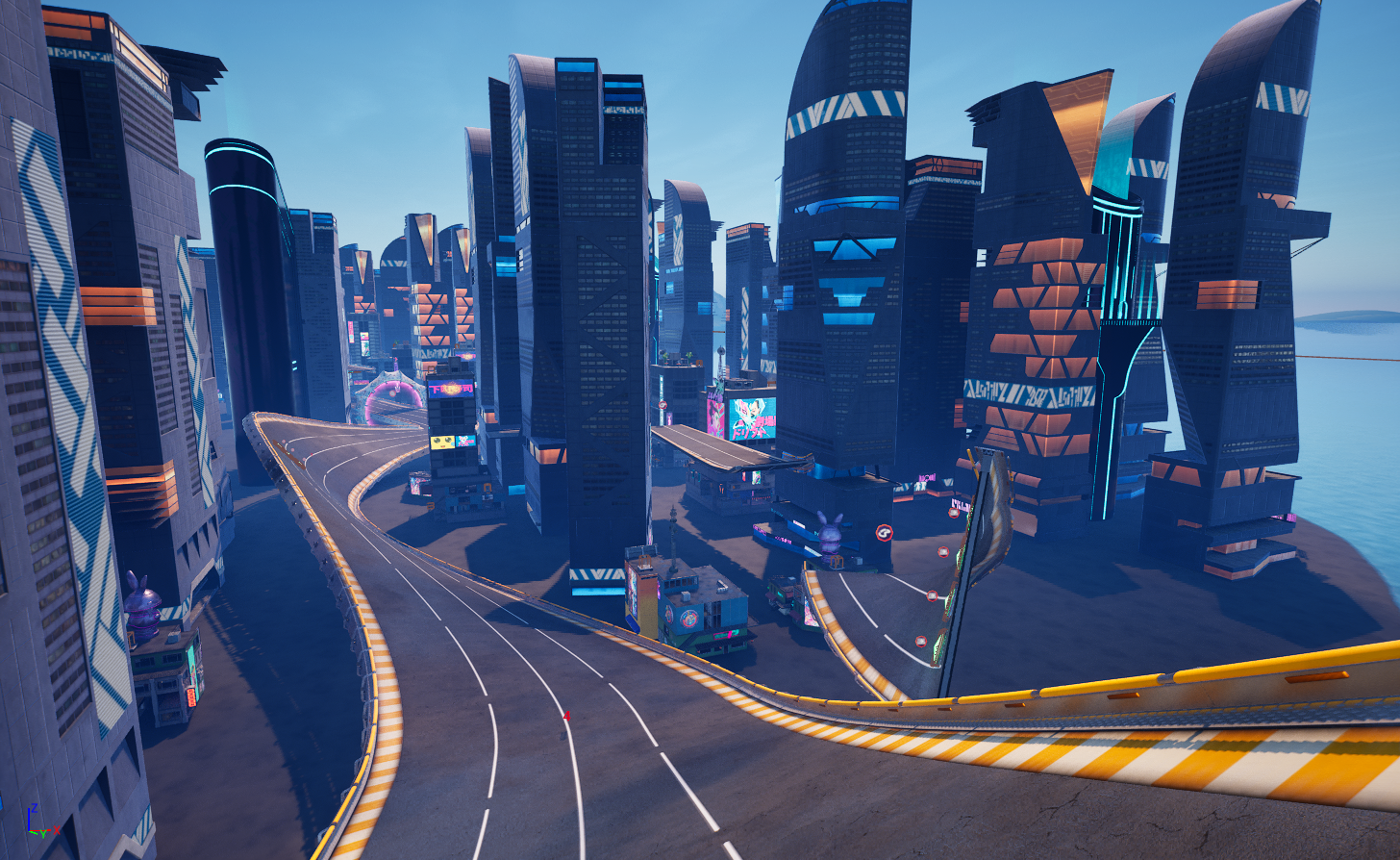 Neon Blur is race track I designed in the gravity defying Rocket Racing game mode in Fortnite. Speed through a cyber city feeling the velocity as the lights of the neon signs race past you. Using this project I was able to study into track design both realistic and arcade to find out the differences and to see where I could combine the two design philosophies.